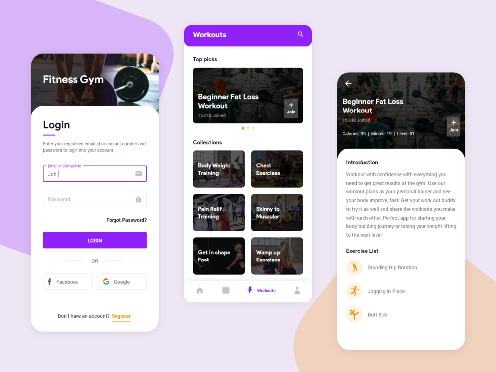 3 Screens of Fitness gym mobile app design